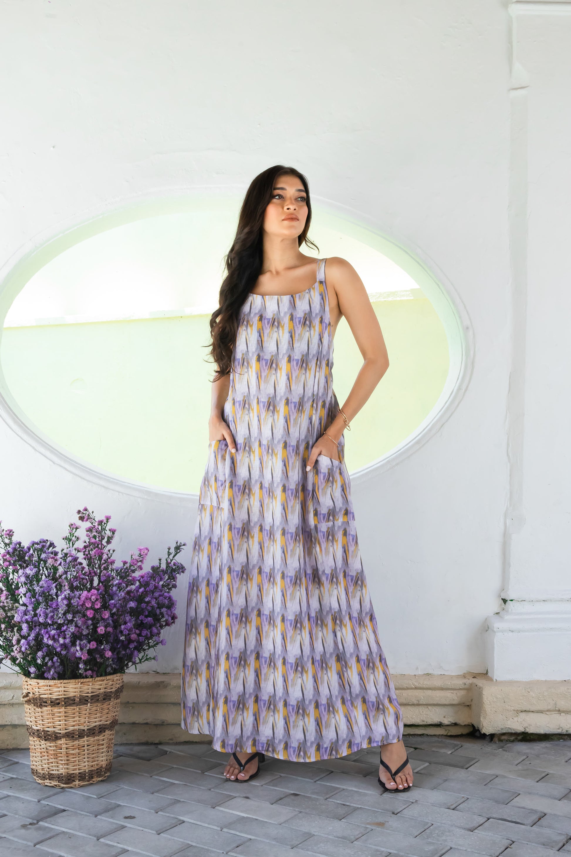 The Isla Dress in grey combines refined elegance with island-inspired ease, featuring a delicate back tie for a subtle, sophisticated touch.